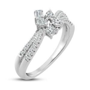 This enchanting diamond ring collection features five distinctively-shaped diamonds, symbolic of everything she means to you. Each diamond shape has a different meaning, from integrity and wisdom, to confidence, totality, and elegance. The beautiful 10K white gold ring features an oval-cut, emerald-cut, pear-shaped, round-cut, and princess-cut diamond at the center, while ribbons of brilliant round-cut diamonds flow outward. The gorgeous ring has a total diamond weight of 1/2 carat.