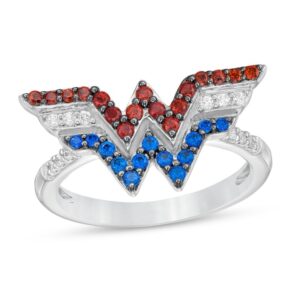 Crafted in sterling silver and warm 10K gold, this vibrant ring features royal red garnets, brilliant blue sapphires, and a polished yellow gold ribbon. Polished to a dazzling shine, this silver ring is sure to be admired. This ring is only available in size 7. Sterling silver rings cannot be resized after purchase.